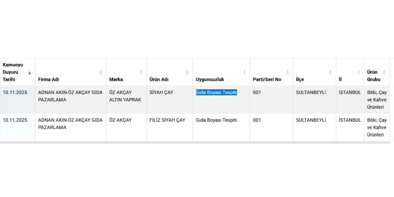 Firmanın “Öz Akçay Altın” marka Yaprak Siyah Çay ve “Öz Akçay” marka Filiz Siyah Çay isimli ürünlerinde gıda boyası bulunduğu tespit edildi.