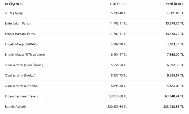 Tüm ödemelere zam geldi! 65 yaş aylığı, evde bakım parası ve kıdem tazminatı arttı